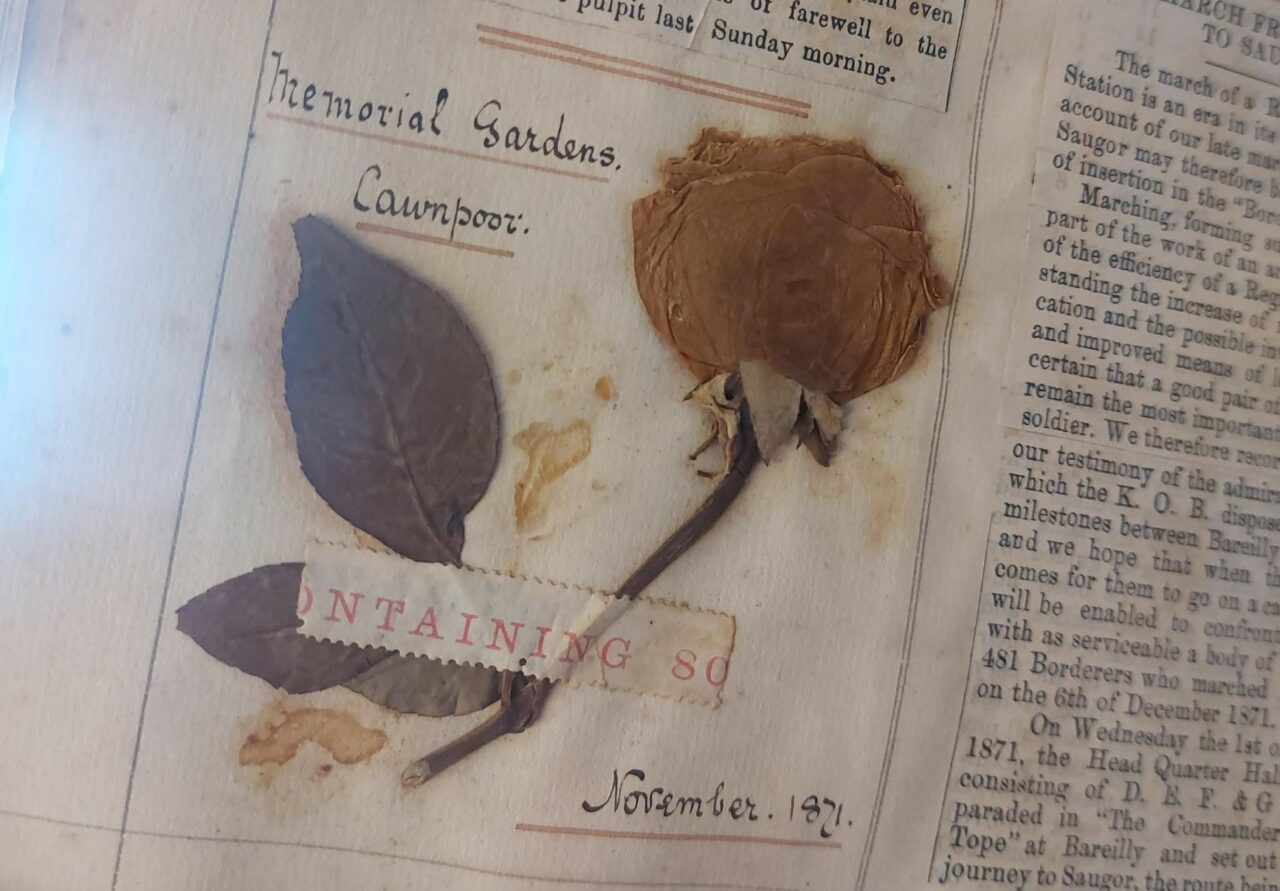 The book itself is filled with articles, dance invitations, dinner invitations, poems, pictures and songs. Lieutenant Turner’s commission scrolls, dated the 7th of November 1862 and the 15th of May 1866, are also neatly folded inside. There are pressed flowers attached to the pages, along with the date and location at which they were collected. Lieutenant Turner has also neatly cut out the various ornate designs of Regimental letter heads and decorated many of the pages with them.