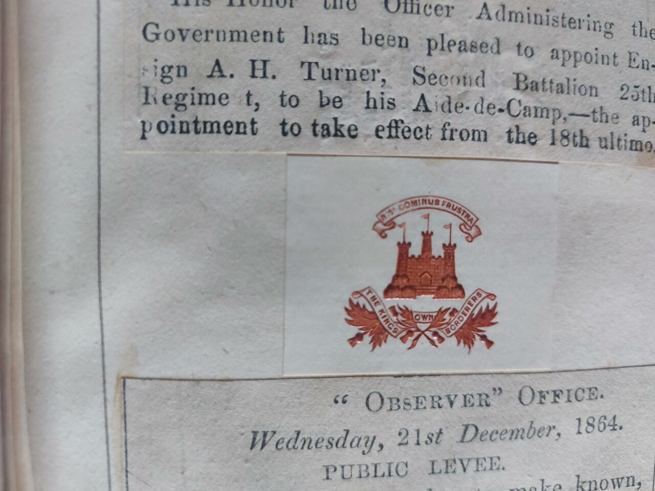 It was Saturday the 22nd of April, 1863, Edinburgh. The 25th Regiment held an extravagant ball at the Assembly Rooms, lavishly decorated, decadently catered for, and attended by a host of the ‘great and good’ of society. A scrapbook from the time, created by Lieutenant A.H. Turner of the 2nd Battalion KOB, contains an article which describes the event in detail.