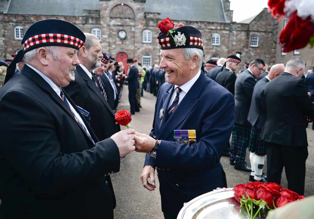 Thus, according to regimental tradition, on 1st august every member wears a red rose in his head-dress. The tradition probably began in the 1880s but was officially authorised in 1935. Since WWII the day has commenced with the playing of the long reveille by the pipes and drums marching through barracks or camp. Following this red roses are presented to the regimental officers by the CO, or if present the Colonel in Chief of the regiment at a ceremonial parade.